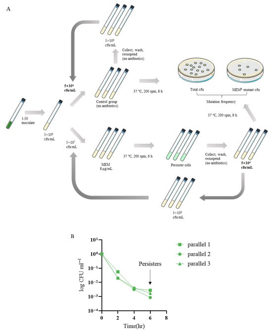 Briefly, overnight bacterial cultures were diluted into fresh LB to an OD600 of 0.05. The bacteria were cultured for 2 h until the OD600 reached approximately 0.8~1.0. Then, the bacteria were treated with 8 μg/mL meropenem. At each indicated time point, an aliquot of the cultures was taken out. The bacteria were washed with 0.9% NaCl three times, followed by serial dilution and plating on LB agar for colony-forming unit (CFU) counting [31,32]. All experiments were conducted in biological triplicates.