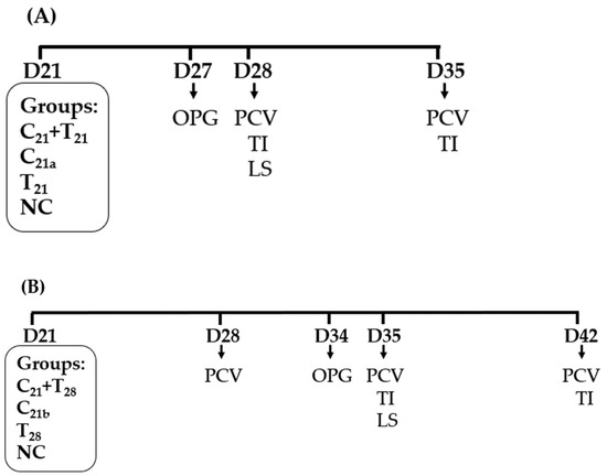 Schematic presentation of chicken anemia virus (CAV) and/or Eimeria tenella (E. tenella) infections and sampling. (A) In Trial A, all treatment groups were infected with CAV and/or E. tenella on day 21 (D21). The negative control (NC) group received phosphate-buffered saline (PBS) only. Concurrent co-infection with CAV and E. tenella was designated as C21 + T21, infection with CAV alone as C21a, and with E. tenella alone as T21. (B) In Trial B, chickens were infected with CAV at D21 and secondarily with E. tenella at D28 (C21 + T28). Groups infected with CAV alone at D21 or E. tenella alone at D28 were designated as C21b and T28, respectively. Downward arrows indicate sampling for ceca lesion scores (LS), oocysts per gram (OPG) of feces, packed cell volume (PCV), and thymus index (TI).