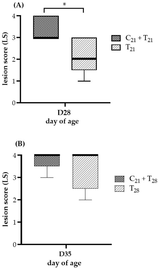 Ceca lesion severity after dual infection with chicken anemia virus (CAV) and Eimeria tenella (E. tenella) vs. E. tenella alone. (A) Trial A: Lesions were evaluated on Day 28 (7 days post-infection, dpi, with E. tenella), comparing concurrent co-infection with CAV and E. tenella at 21 days of age (C21 + T21) vs. E. tenella infection alone at the same age (T21). (B) Trial B: Lesions were evaluated on Day 35 (7 dpi with E. tenella), comparing chickens infected with CAV at Day 21 and secondarily with E. tenella at Day 28 (C21 + T28) vs. E. tenella infection alone at Day 28 (T28). Five chickens per group (n = 5) were randomly selected for necropsy. Lesion severity was scored on a scale from 0 (normal) to 4 (most severe), following the criteria described by Johnson and Reid [36]. Medians and interquartile ranges (IQR) were compared using the Mann–Whitney U test and are shown as box plots. Asterisk (*) indicates p < 0.05.