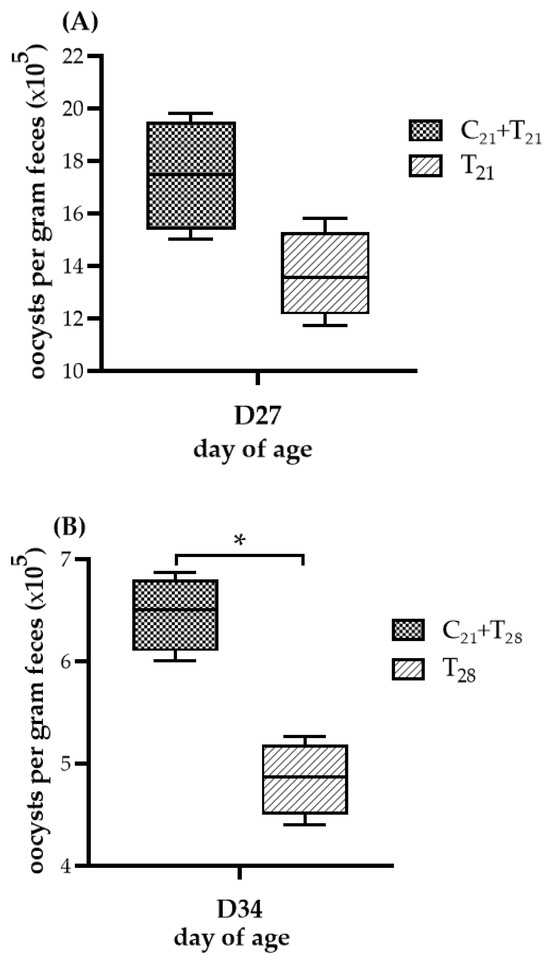 Oocyst shedding following dual infection with chicken anemia virus (CAV) and Eimeria tenella (E. tenella) vs. E. tenella alone. (A) Trial A: Oocysts per gram (OPG) of feces measured on Day 27 (5 days post-infection, dpi, with E. tenella), comparing the concurrent infection group at Day 21 (C21 + T21) vs. the group infected with E. tenella alone (T21). (B) Trial B: OPG measured on Day 34 (5 dpi with E. tenella), comparing secondary infection group (C21 + T28) vs. the group infected with E. tenella alone (T28). Each group (n = 12) was divided into 4 subgroups; pooled feces from 3 chickens per subgroup (n = 4) were analyzed using the McMaster counting method. Results ( × 105) are shown as box plots with medians and interquartile ranges (IQR) using Mann–Whitney U test. Asterisk (*) indicates p < 0.05.