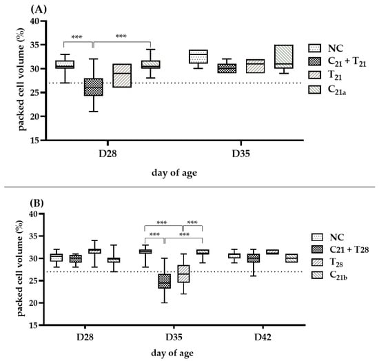 The severity of anemia (PCV < 27%) in each group is shown in Figure 4. In Trial A (D28), the C21 + T21 group developed anemia in 7 of 12 birds (median 26%), significantly more severe than in the C21a group (4/12; median 30.5%, p < 0.001). In Trial B (D35), the C21 + T28 group showed anemia (median 24.5%), significantly lower than the C21b group (median 31%; p <0.001). Although the median PCV in the T28 group was only slightly below the anemia threshold (27%), it still indicated anemia (median: 26.5%). However, the number of anemic birds was higher in the C21 + T28 group than in the T28 group (9/12 vs. 6/12 birds). At other time points, such as Day 35 in Trial A and Days 28 and 42 in Trial B, the median PCV values remained above the 27%, and thus no clear anemia trend could be established for comparison.