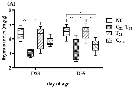 The degree of thymus atrophy, indicated by TI values, is shown in Figure 5. On D35, the groups infected with CAV alone had significantly lower median TI values than the negative controls (3.6 vs. 4.51, p = 0.01 in Trial A; 3.54 vs. 4.71, p = 0.02 in Trial B), while the groups infected with E. tenella alone showed similar values to controls with no statistical significances (4.49 vs. 4.51, p = 0.75; 4.23 vs. 4.71, p = 0.13), indicating CAV as the main cause of atrophy. Furthermore, TI values in the C21 + T21 and C21 + T28 groups were significantly lower than their respective controls (3.15 vs. 4.51, p = 0.007; 3.38 vs. 4.71, p = 0.045), and also lower than the groups infected with CAV alone (C21a and C21b), though not significantly (3.15 vs. 3.6, p = 0.83; 3.54 vs. 4.71, p = 0.75). Compared to the T21 and T28 groups (3.15 vs. 4.49; 3.38 vs. 4.23), the difference was significant in Trial A (p = 0.01), but not in Trial B (p = 0.23). These findings suggest that concurrent co-infection and secondary E. tenella infection may aggravate thymus atrophy at this time point.