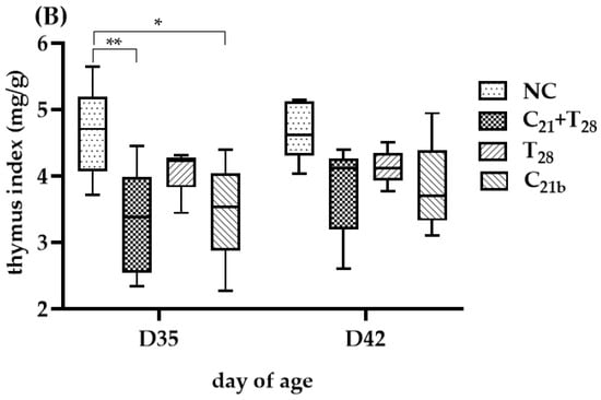 Thymus atrophy was evaluated using the thymus index (TI), calculated as the ratio of thymus weight to body weight (mg/g), which is inversely related to the degree of atrophy. In Trial (A), TI values were obtained from 5 chickens per group on Day 28 (7 days post-infection [dpi] with CAV and/or E. tenella; n = 5), and from another 5 chickens on Day 35 (14 dpi; n = 5). In Trial (B), 5 chickens per group were sampled on Day 35 (14 dpi with CAV; 7 dpi with E. tenella; n = 5) and Day 42 (21 dpi with CAV; 14 dpi with E. tenella; n = 5). Statistical analysis was conducted using the Kruskal–Wallis test followed by Dunn’s post hoc test. Box plots display medians and interquartile ranges (IQR). Asterisks indicate significance (*, p < 0.05, and **, p < 0.01).