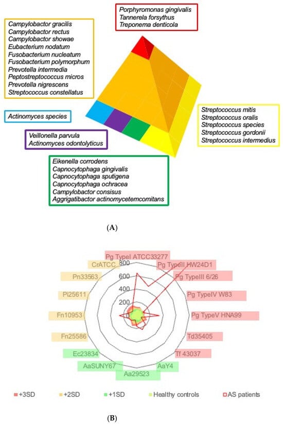 Status of antibody titer to periodontal pathogenic bacteria. (A) Schematic illustration of periodontal pathogenic bacteria classified by Socransky’s criteria. Periodontal pathogenic bacteria exist in a defined order. They are divided into six categories, and each is coded by color. Blue, purple, green, and yellow complexes form the basic attachment to the body surfaces such as teeth and mucosa. The red complex is a definite pathogen in periodontitis, while the orange complex primarily functions as a connecting anchor for the members of the red complex within the biofilm. (B) Average antibody titer against representative periodontal pathogenic bacteria. Antibody titers against each pathogenic bacterium are standardized to the average value of healthy controls. The red area in the radar chart demonstrates a +3 S.D. titer from healthy controls, the orange area a +2 S.D., and the green area a +1 S.D., respectively. The average of AS/AR patients in this study is shown in the red line. Porphyromonas gingivalis (Pg), Treponema denticola (Td), Tannerella forsythia (Tf), Aggregatibacter actinomycetemcomitans (Aa), Eikenella corrodens (Ec), Fusobacterium nucleatum (Fn), Prevotella intermedia (Pi), Prevotella nigrescens (Pn), and Campylobacter rectus (Cr). (C) Correlation of antibody titers against the periodontal pathogenic bacteria and periodontal stage of AS/AR patient. Antibody titers against bacteria classified into red, orange, blue, and green complexes were summed as an index and plotted for the 13 patients who had remaining teeth and for whom serum could be collected. The antibody titer of healthy individuals was set to 100. Lines in the figure demonstrate regression lines.