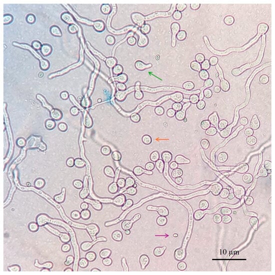 Conidial viability observed under an optical microscope. The germinated active conidia are indicated by the green arrow, the non-germinated active conidia are indicated by the orange arrow, and the inactive conidia are indicated by the purple arrow.