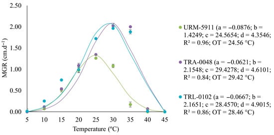 Regression equation, coefficient of determination (R2), and optimal temperature (OT) for mycelial growth of Trichoderma spp. isolates adjusted with values of the mycelial growth rate (MGR) at temperatures of 5, 10, 15, 20, 25, 30, 35, 40, and 45 °C. URM-5911 = T. asperellum; TRA-0048 = T. asperellum; TRL-0102 = T. longibrachiatum.