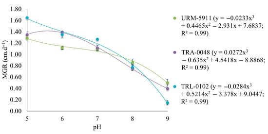 The cubic polynomial regression model selected to describe mycelial growth at the different pH levels fitted the MGR data with an R2 value of 0.99 for all the evaluated Trichoderma spp. isolates (Figure 4).