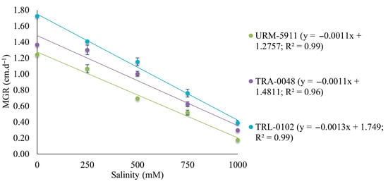 The linear regression model selected to describe mycelial growth at the different salinity concentrations fitted the MGR data with an R2 ≥ 0.96 for all the evaluated Trichoderma spp. isolates (Figure 6).