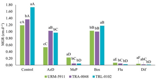 Effect of fungicides on mycelial growth rate (MGR) in cm·d−1 of Trichoderma spp. isolates. Lowercase letters compare isolates within same fungicide, and uppercase letters compare each isolate in different fungicide treatments by Tukey’s test at 5% probability level. AzD = Azoxystrobin + Difenoconazole; MeP = Metiram + Pyraclostrobin; Bos = Boscalid; Flu = Fludioxonil; Dif = Difenoconazole. URM-5911 = T. asperellum; TRA-0048 = T. asperellum; TRL-0102 = T. longibrachiatum.