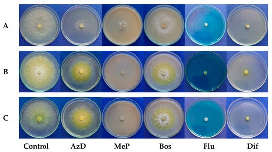 Mycelial growth of Trichoderma spp. isolates at fungicides Azoxystrobin + Difenoconazole (AzD), Metiram + Pyraclostrobin (MeP), Boscalid (Bos), Fludioxonil (Flu), and Difenoconazole (Dif). (A) = URM-5911 (T. asperellum). (B) = TRA-0048 (T. asperellum). (C) = TRL-0102 (T. longibrachiatum).