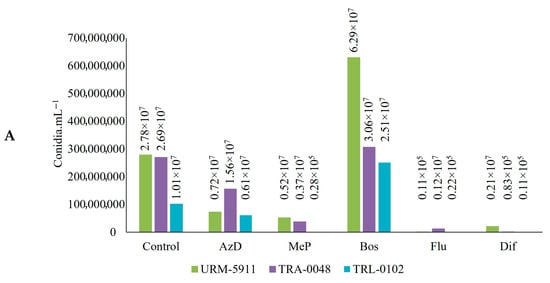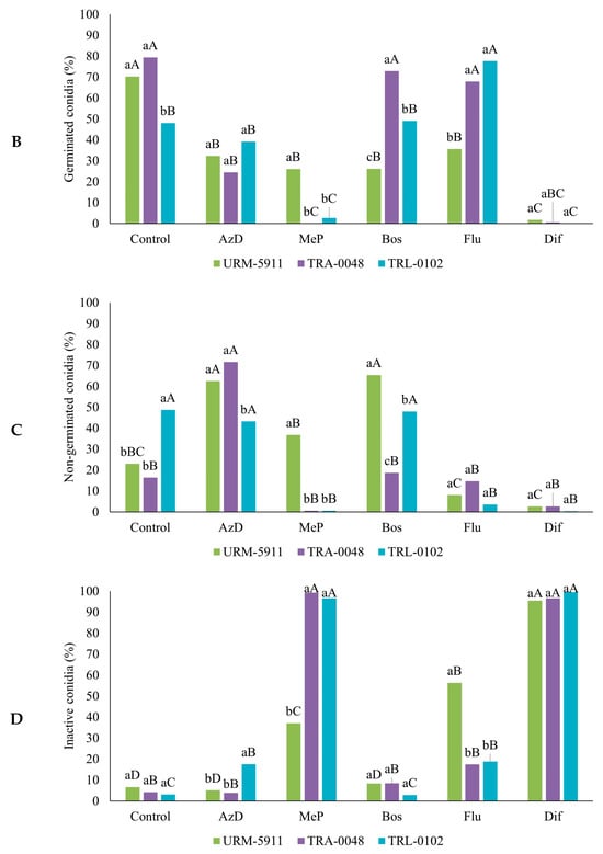For isolate URM-5911, all the treatments containing fungicides reduced the percentage of germinated active conidia compared to that of the control, with the lowest percentage observed for the fungicide Flu (36.0%) (Figure 10B). The highest percentage of non-germinated conidia was observed in the treatments containing AzD (63.0%) and Bos (65.0%) (Figure 10C), while Dif resulted in the highest percentage of inactive conidia (96.0%) (Figure 10D).