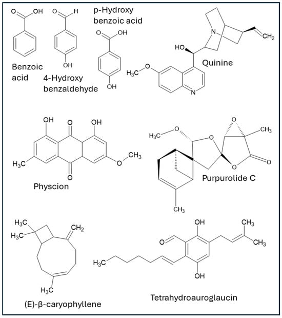 Quinine, a widely known anti-malarial drug normally extracted from the bark of the cinchona tree, has also been shown to be isolated from Colletrotrichum spp., an endophyte from Cinchona calisaya Wedd. []. This compound has been known to be an effective remedy for treating infected wounds since 1916, as referred to by Lt.Col. P.H. Falkner, R.A.M.C. [], with more modern studies where its use is being reported for skin-related diseases [,].