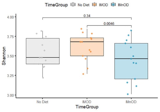 The aggregated data regarding the alpha diversity in the three dietary groups (No Diet, IMOD and IMnOD), assessed using the Shannon index, are reported in Figure 1. The median Shannon diversity showed a consistent trend of being higher in the IMOD group compared to the IMnOD group.