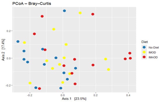 Beta diversity analysis using Bray–Curtis dissimilarity. PCoA plot showing sample distribution based on Bray–Curtis dissimilarity across different diet groups: No diet, IMOD and IMnOD. Abbreviations: IMnOD, Italian Mediterranean non-Organic Diet; IMOD, Italian Mediterranean Organic Diet; No Diet: free diet.