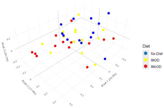 Figure 2 and Figure 3 display the distribution of samples along the first three principal coordinates derived from Bray–Curtis dissimilarity, which together capture a substantial portion of the variation in gut microbial composition (Axis 1 = 23.5%, Axis 2 = 17.4%, Axis 3 = 10.4%). As shown in the 2D and 3D PCoA plots, samples from the IMnOD group (red) tend to cluster toward the right side of Axis 1, partially separated from the No Diet group (blue), which is more dispersed and concentrated in the left quadrant. The IMOD group (yellow) exhibits an intermediate distribution, overlapping both other groups, but with several individuals extending along Axis 2.