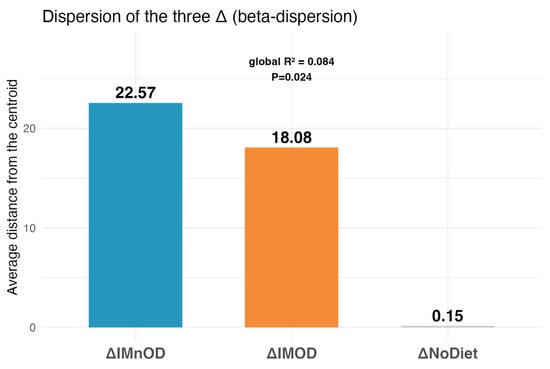 Additionally, beta-dispersion analysis revealed significant differences in the within-group variability (p = 0.024, R2 = 0.084), with the highest dispersion in the IMnOD, moderate dispersion in the IMOD, and minimal dispersion for No Diet (Figure 4).