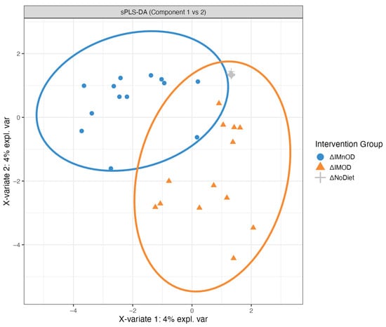 sPLS-DA plot showing microbial separation across dietary interventions. Discriminant analysis of microbial community shifts using sparse Partial Least Squares Discriminant Analysis (sPLS-DA), based on delta changes (Δ) in microbiota composition. Distinct clustering is observed between the IMnOD (blue circles) and IMOD (orange triangles) groups, with minimal overlap. The No Diet group (gray crosses) shows little separation.