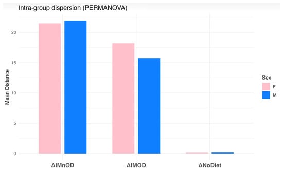 To further explore intra-group variability, beta-dispersion analysis was performed based on the Euclidean distances to group centroids. As shown in Figure A2 (Appendix A), dispersion patterns varied across intervention groups and sexes.