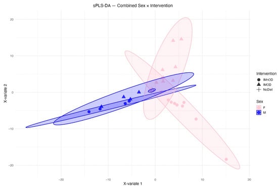 Figure 7 further illustrates these sex-specific responses using sPLS-DA plots stratified by sex. Among females, a clear separation between intervention groups (IMOD, IMnOD, NoDiet) was observed, suggesting that dietary intervention produced distinguishable shifts in the composition of the gut microbiota. In contrast, the sPLS-DA for males showed more compact clustering and less separation between groups, possibly due to the limited sample size (n = 4 per group).