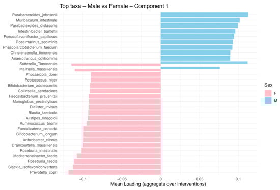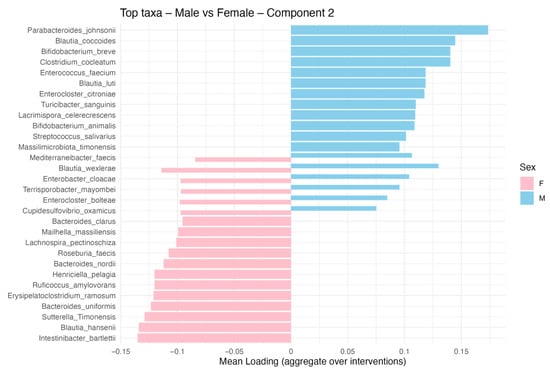 Moreover, distinct microbial signatures were identified for each sex: in men (blue), taxa such as Parabacteroides johnsonii, Muribaculum intestinale, Parabacteroides distasonis and Intestinibacter barletti displayed a high discriminative power for Component 1. Along Component 2, Parabacterioides johnsonii, Blautia coccoides, Bifidobacterium breve, Clostridium cocleatum and Enterococcus faecium were also dominant. In women (pink), the GM was characterized by the enrichment of Prevotella copri, Roseburia faecis, Sklackia isofalvoniconvertens Mediterraneaneibacter faecis, Faecalibacterium prausnitzii, Collinsella aerofaciens and Sutterella timonensis for Component 1. On Component 2, taxa such as Sutterella timonensis, Intestinibacter bartlettii, Blutia hansenii and Bacteroides uniforms were more strongly represented. Components 1 and 2 are reported in Figure 8.