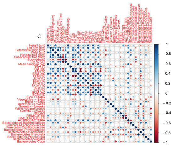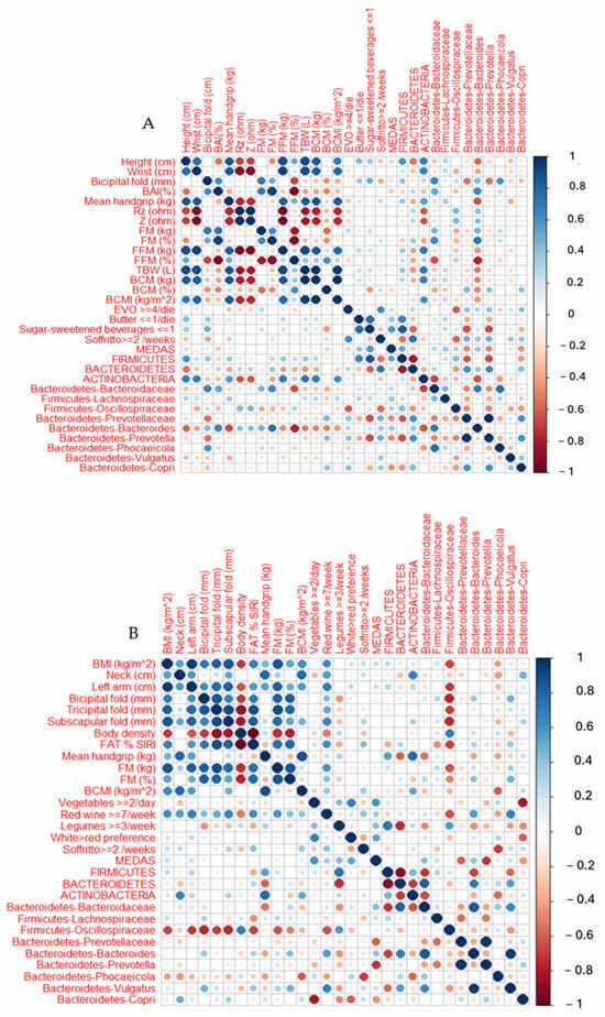 Pearson correlation analyses were performed to investigate the associations between microbial taxa and anthropometric, dietary, and bioimpedance variables. Correlation matrices were visualized for each dietary phase, highlighting significant associations (p < 0.05).