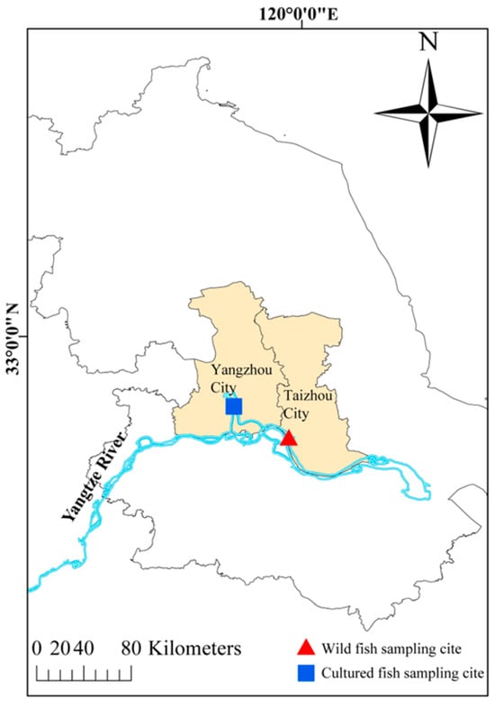 Between June and November 2023, ten (10) C. nasus were collected from two distinct locations in or near the Yangtze River (119.54 E 32.28 N, 119.29 E 32.14 N) in Jiangsu Province, China, to investigate variations in muscle physical and chemical properties, as well as gut microbiota composition, between cultured and wild populations (Figure 1). Specifically, five (5) wild C. nasus samples, with an average body length of 317.46 ± 5.23 mm, were obtained from the Taizhou section in the Yangtze River, while the other five (5) cultured specimens, averaging 193.73 ± 5.47 mm in body length, were sourced from an intensive pond culture farm in Yangzhou.