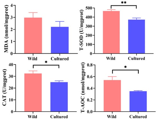 Antioxidant capacity of cultured and wild C. nasus. MDA, malondialdehyde; T-SOD, total superoxide dismutase; CAT, catalase; T-AOC, total antioxidant capacity. * represents significant difference (p < 0.05); ** represents extremely significant difference (p < 0.01).