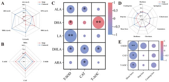 The correlation between n-3/n-6 PUFAs, antioxidant capacity, and meat quality indicators. (A,B,D) The radar chart representing the differences in composition of n-3 and n-6 PUFAs, antioxidant status, and meat quality in the muscle between wild and cultured C. nasus. (C,E) The heatmap showing the correlations between antioxidant capacity, n-3 and n-6 PUFAs, and meat quality. * represents significant difference (p < 0.05); ** represents extremely significant difference (p < 0.01).