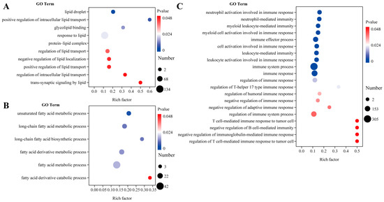 To enhance our understanding of the differences in fatty acid metabolism and immune function in the muscle tissue of wild versus cultured C. nasus, we performed a GO enrichment analysis focusing on lipid and fatty acid metabolism as well as immune response (Figure 4). In comparison to the wild C. nasus, the farmed fish exhibited an enrichment of GO terms related to these processes, with counts of 10 (Figure 4A), 6 (Figure 4B), and 20 (Figure 4C), respectively. Notably, the terms with the highest enrichment factors and a p < 0.05 value included positive regulation of intracellular lipid transport, fatty acid derivative catabolic process, T cell-mediated immune response to tumor cells, negative regulation of B cell-mediated immunity, negative regulation of immunoglobulin-mediated immune response, and regulation of T cell-mediated immune response to tumor cells.