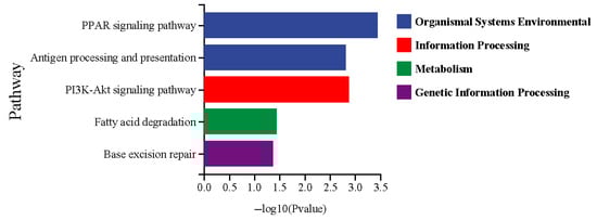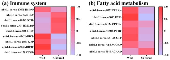 To further elucidate the principal signaling pathways implicated in fatty acid metabolism and the immune system, a KEGG enrichment analysis was conducted (Figure 5). The DEGs were enriched in five KEGG pathways, such as the PPAR signaling pathway, antigen processing and presentation, the PI3K-Akt signaling pathway, fatty acid degradation, and base excision repair. To identify specific genes related to fatty acid metabolism and the immune system, a combined GO and KEGG enrichment analysis was performed to select DEGs common to both analyses (Figure 6). Nine DEGs related to the immune system were observed, including HSP90, P53, NTH, HMGB1, LIG3, MHC I, β2M, MHC II, and CTSB (Figure 6a). Among these, HSP90, MHC I, β2M, MHC II, and CTSB were upregulated in the wild C. nasus, whereas P53, NTH, HMGB1, and LIG3 were upregulated in the cultured. Additionally, seven DEGs involved in fatty acid metabolism were identified, including PPARγ, RXR, CPT1A, CPT1B, ACSL4, ACOX3, and ACAA2 (Figure 6b). Compared with the wild group, ACAA2 was upregulated in the cultured group, while PPARγ, RXR, CPT1A, CPT1B, ACSL4, and ACOX3 were downregulated.