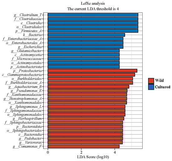 Linear discriminant analysis effect size (LEfSe) analysis of gut microbiota composition of C. nasus between cultured and wild environments (LDA > 4).