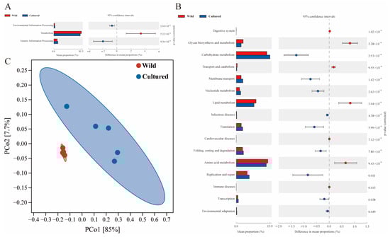 At KEGG level 1, the gut microbiota of C. nasus was primarily associated with essential functional categories, including metabolism, genetic information processing, and environmental information processing (Figure 8A). Moreover, at KEGG level 2, notable differences were identified in the distribution of diet-related functional categories between cultured and wild C. nasus, specifically in carbohydrate metabolism, amino acid metabolism, and lipid metabolism (p < 0.05) (Figure 8B). The category pertaining to replication and repair, which was related to the immune system, was also identified. Additionally, the PCoA plot distinctly demonstrated that the gut microbiota in wild and cultured C. nasus were clearly distinguishable (Figure 8C).