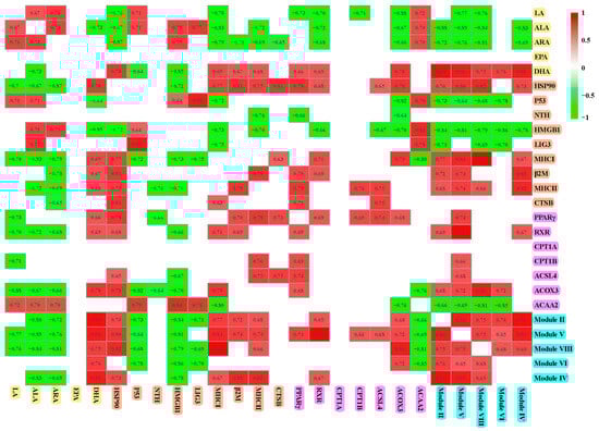 As illustrated in Figure 9, a positive correlation was observed among LA, ALA, and ARA, whereas DHA exhibited a negative correlation with ALA. LA, ALA, and ARA demonstrated negative correlations with HSP90, MHC I, RXR, and ACOX3 but positively related to ACAA2. ARA negatively related to β2M and CTSB. DHA showed negative correlations with P53 and HMGB1, yet it was positively correlated with indices related to immune defense, such as HSP90, MHC I, β2M, and MHC II, as well as fatty acid metabolism markers including PPARγ, RXR, and ACOX3. HSP90 was positively correlated with MHC I, β2M, MHC II, CTSB, PPARγ, RXR, ACSL4, and ACOX3, while exhibiting a negative correlation with HMGB1. P53 was negatively related to HMGB1, LIG3, and ACAA2, and positively related to MHC I and ACOX3. PPARγ negatively correlated with NTH and positively related to β2M, MHC II, CTSB, RXR, CPT1B, ACSL4, and ACOX3. Modules II, V, and VIII were positively correlated with each of the other four modules. These modules also exhibited negative correlations with ALA, ARA, P53, HMGB1, and ACAA2 while showing positive correlations with DHA, HSP90, MHC I, MHC II, and ACOX3. Additionally, modules VI and IV were positively related to DHA and negatively related to HMGB1.