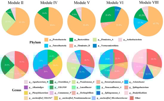 Composition of the dominant modules as identified by WGCNA at the phylum and genus levels.
