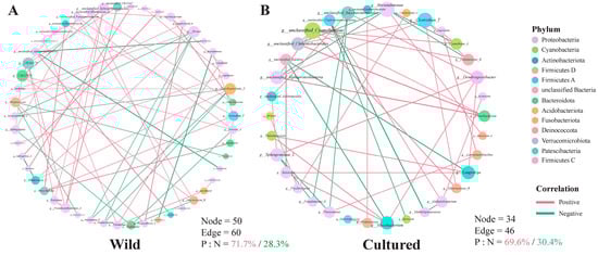 Gut microbiota genus-level interaction network. (A) wild group; (B) cultured group. Each node represents a genus. Node colors denote genera belonging to various major phyla. A green edge represents a negative interaction between two nodes, while a red edge represents a positive interaction.