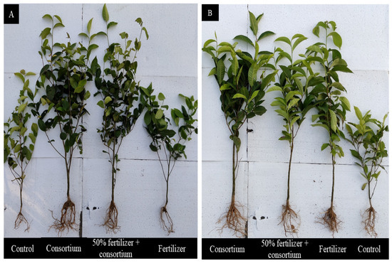 The positive effects on shoot and leaf counts, chlorophyll contents, and enzymes are known to enhance plant growth by increasing the nutrient availability through root exudate buildup, phosphate solubilization, and nitrogen accumulation activities, and the nutrient uptake in tea plants, which could be beneficial for host plants [49,50].