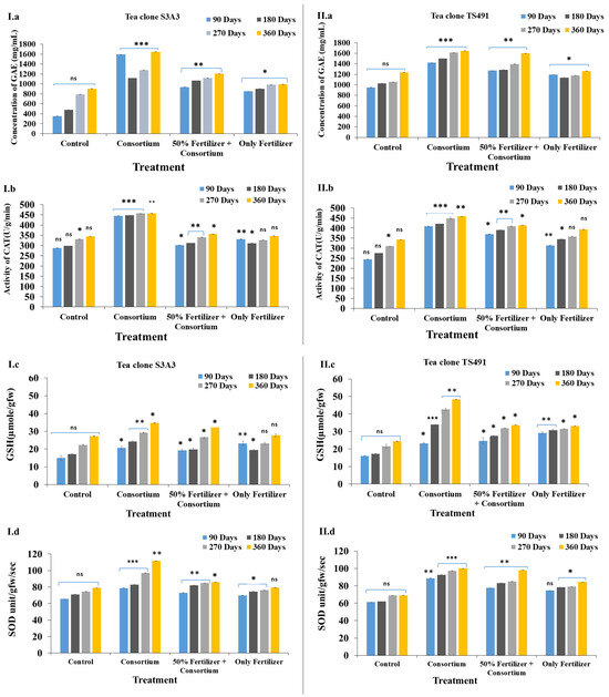 Field trials conducted over 90 to 360 days demonstrated a progressive effect of the PGPB treatment on the tea plants, as measured by the phenol content, superoxide dismutase (SOD) activity, glutathione (GSH) content, and catalase (CAT) activity. Gallic acid equivalents (GAEs), a key indicator of the total phenolic content, play a vital role in plant defense and antioxidant activity. PGPB inoculation has been shown to enhance polyphenol levels, SOD activity, and the overall antioxidant capacity, thereby improving plant resilience to microbial stress [58,59]. In the present study, the highest phenolic content was observed in the consortium-treated plants, at 1643.6 mg GAE/mL in S3A3 and 1646.93 mg GAE/mL in TS491. In contrast, the control and fertilizer-only treatments showed lower GAE levels: 905.6 mg/mL and 992.93 mg/mL (control) and 1238.26 mg/mL and 1260.93 mg/mL (consortium), respectively (Figure 2(I.a,II.a)). These findings align with those of Mittler [60], who also reported increased phenolic accumulation under consortium application compared to individual strains.