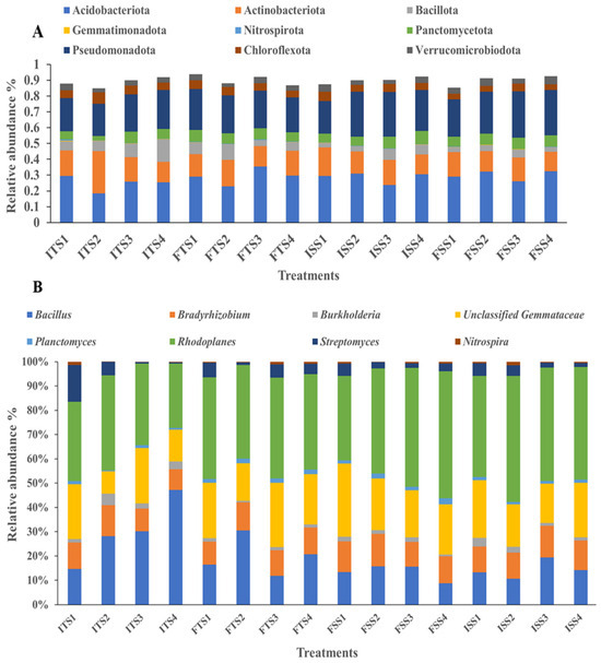 Bacterial communities at the (A) phylum level and (B) genus level for the different treatments (samples collected before and after treatments): ISS1 (control), ISS2 (consortium), ISS3 (50% fertilizer + consortium), ISS4 (fertilizer) represent data for “before treatment”, while FSS1 (control), FSS2 (consortium), FSS3 (50% fertilizer + consortium), and FSS4 (fertilizer) represent data for “after treatment” as analyzed for the S3A3 tea clone. Similarly, ITS1 (control), ITS2 (consortium), ITS35 (0% fertilizer + consortium), and ITS4 (fertilizer) represent data for “before treatment” and FTS1 (control), FTS2 (consortium), FTS3 (50% fertilizer + consortium), and FTS4 (fertilizer) represent data for “after treatment” as analyzed for the TS491 tea clone.