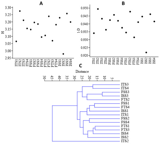 (A) Shannon (H) index, (B) Simpson diversity index, and (C) beta diversity analysis of the samples using a Whittaker index distance matrix. The treatments include the control, consortium, 50% fertilizer + consortium, and fertilizer. For the S3A3 tea clone, these are denoted as ISS1, ISS2, ISS3, and ISS4 for the samples collected before treatment, and as FSS1, FSS2, FSS3, and FSS4 for the samples collected after treatment. Similarly, for the TS491 tea clone, ITS1–ITS4 represent the respective treatments before the application, while FTS1–FTS4 correspond to the samples after treatment. Detailed treatment descriptions are provided in the main text.
