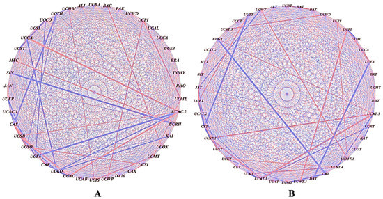 Co-occurrence analysis illustrating the strength of the correlations between the different bacterial genera: (A) S3A3 and (B) TS491. The thickness of the lines between the nodes denotes the strength (p < 0.05). Red lines indicate a positive correlation among the abundances of the linked taxa, whereas the blue lines indicate a negative correlation. The network was visualized using Cytoscape (Version 3.9).