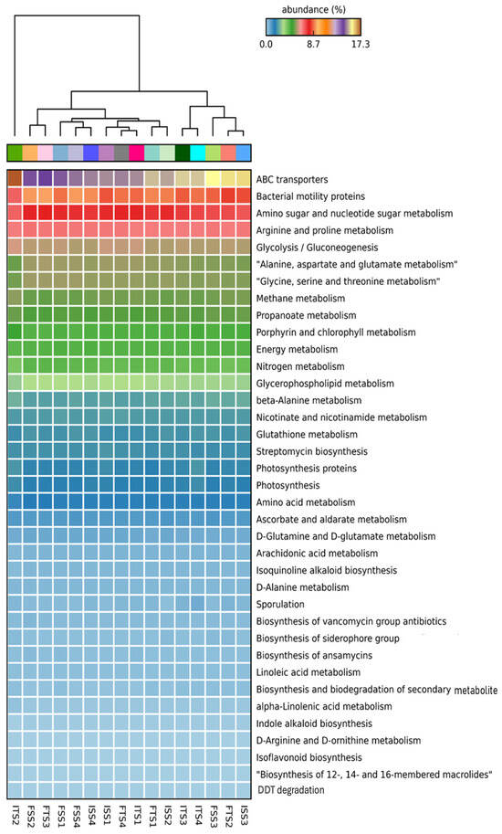The bacterial diversity was assessed using alpha diversity metrics via rarefaction to estimate the species richness from amplicon sequence variants (ASVs). The consortium-inoculated soils (ISS2, FSS2, ITS2, FTS2) showed higher abundances of the selected bacteria, whereas the uninoculated soils (ISS1, FSSI, ITS1, FTS1) exhibited greater overall diversity. The Shannon and Simpson indices were used to quantify the diversity, with the Shannon index reflecting the species diversity (Figure 4A) and the Simpson index estimating the species richness (Figure 4B). The beta diversity, based on Whittaker distances, indicated that the uninoculated control was distinct, while the other samples shared common genera (Figure 4C).
