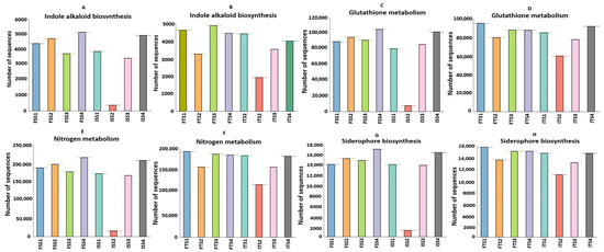 The functional annotation of metagenomic data using KEGG pathways reveals significant alterations in the microbial functional profiles across the treatments involving the chemical fertilizer and bacterial consortium application in the two tea clones, S3A3 and TS491. Notably, the consortium-treated soils exhibited a distinct enrichment in genes associated with key plant growth-promoting functions compared to the fertilizer-treated soils, emphasizing the role of rhizosphere microbiota in sustainable nutrient management. Heatmap clustering demonstrates the clear segregation of the microbial community functions between the fertilizer- and consortium-treated soils. Additionally, functional genes related to ABC transporters, amino sugar and nucleotide sugar metabolism, glycolysis, amino acid metabolism, and the biosynthesis of membrane macrolides were elevated in the consortium-treated samples compared to the controls. The KEGG level 1 analysis revealed significant changes in the gene abundance, affecting major protein groups, including metabolism, environmental information processing, genetic information processing, and cellular functions (Figure 6). Such metabolic richness likely supports improved nutrient acquisition, signaling, and defense priming in tea plants [93]. The KEGG level 3 analysis indicated that the treatments with the bacterial consortium and fertilizer bio-stimulation increased the functional abundances in the plant varieties S3A3 and TS491. In the present study, with the consortium treatment (both S3A3 and TS491), notable enhancements were observed in several metabolic pathways of the rhizosphere, including indole alkaloid biosynthesis, glutathione metabolism, nitrogen metabolism, and non-ribosomal peptide siderophore biosynthesis. The examination of the metabolic pathways revealed that the modifications among the rhizosphere soils treated with the various fertilizers were primarily caused by the enhanced pathways linked to the metabolism of sugars, amino acids, and alkaloids. It is well known that macrolides suppress a variety of diseases, including those that are caused by pathogenic fungi [94]. The KEGG analysis revealed the elevated expressions of genes involved in indole alkaloid biosynthesis and other secondary metabolite pathways (Figure 7A,B) in the consortium-treated groups. These compounds are not only plant defense molecules but may also modulate plant–microbe interactions. This observation suggests that the bacterial consortium fosters a microbiome capable of supporting systemic resistance in tea plants. Genes involved in glutathione metabolism, a crucial antioxidant defense pathway, were significantly enriched in the consortium-treated soils (Figure 7C,D). This suggests that microbial consortia may contribute to redox homeostasis in the rhizosphere, enhancing the tea plant tolerance to abiotic stresses such as drought or oxidative stress [95]. Notably, the sharp decline in glutathione metabolism genes in the ISS2 and ISS3 samples suggests that chemical fertilizers may suppress microbial functions related to stress alleviation.