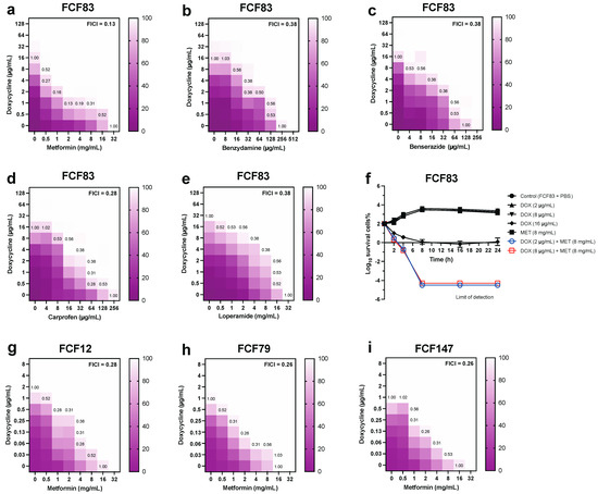 Checkerboard and time–kill analyses evaluating the synergistic antibacterial effects of doxycycline (DOX) combined with five non-antibiotic adjuvants against Pm. (a–e) Heatmaps show the FICI and growth inhibition (%) of DOX combined with metformin, benzydamine, benserazide, carprofen, and loperamide, respectively. Synergistic interactions (FICI ≤ 0.5) were observed for all five compounds, with metformin showing the strongest synergy (FICI = 0.13). Gradient bars indicate the percentage of bacterial growth inhibition; (f) Time–kill curves demonstrate the enhanced bactericidal activity of DOX when combined with metformin (8 mg/mL) at different DOX concentrations (2, 8, and 16 μg/mL) over 24 h; (g–i) Heatmaps show that DOX–metformin also exerts synergy against other Pm strains including FCF12 (serogroup D), FCF79 (serogroup F), and FCF147 (capsule-deficient mutant), with strongest activity against the serogroup A strain FCF83. All data represent results from three independent experiments.