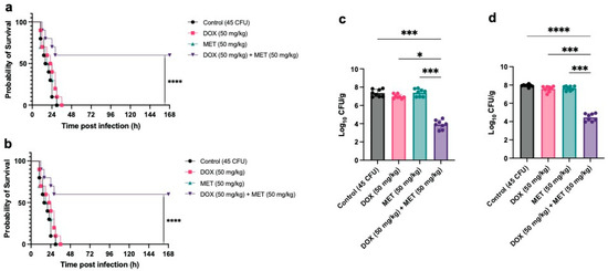 We established PmA infection models in ICR mice and Cherry Valley ducks to evaluate the in vivo therapeutic effects of doxycycline, metformin, and their combination. Due to the high virulence of PmA, administration of a low dose (45 CFU) led to 100% mortality within 36 h in both animal models. Monotherapy with either doxycycline or metformin showed no significant improvement in survival. However, combination therapy markedly reduced mortality, lowering the death rate from 100% to 60% in acutely infected animals (Figure 2a,b). Bacterial load analysis further revealed that the combination significantly decreased pulmonary bacterial burdens in mice and ducks that succumbed within 18–24 h post-infection (Figure 2c,d), supporting the in vivo synergistic efficacy of the metformin–doxycycline treatment.