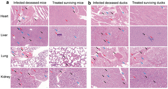 To evaluate histopathological changes, the hearts, livers, lungs, and kidneys were collected from both surviving and deceased mice and ducks in each group. The tissues were fixed in 4% paraformaldehyde, dehydrated, embedded in paraffin, and sectioned into 4 μm thick slices. Sections were mounted on microscope slides and stained with hematoxylin and eosin (H&E) following standard protocols. Histopathological alterations were assessed under a light microscope.