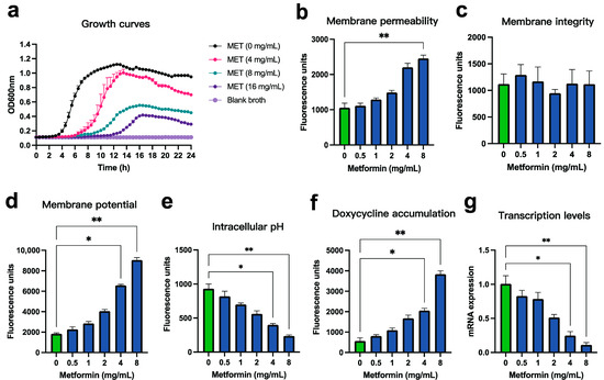 Mechanistic verification analysis of the synergistic antibacterial effect of metformin and doxycycline against Pm. (a) One-step in vitro growth curves of Pm strain FCF83 treated with increasing concentrations of metformin (0–16 mg/mL); (b) Outer membrane permeability assay using the hydrophobic fluorescent probe NPN. Increased fluorescence indicates enhanced permeability upon treatment with metformin (0–8 mg/mL); (c) Membrane integrity analysis using the fluorescent dye PI showed no significant differences in fluorescence intensity among the treatment groups; (d) Membrane potential (Δψ) measurements using DiSC3(5), which exhibits increased fluorescence upon depolarization as the dye is released into the extracellular environment; (e) Intracellular pH (ΔpH) detection using BCECF-AM, a pH-sensitive dye whose fluorescence increases with higher cytoplasmic pH; (f) Doxycycline accumulation assay in Pm cells based on its intrinsic fluorescence, indicating intracellular uptake under metformin treatment (0–8 mg/mL); (g) Relative transcription levels of the tetracycline efflux gene tet(B) under metformin treatment (0–8 mg/mL) as determined by qRT-PCR. All experiments were performed in triplicate. The green bars represent the negative control group without metformin, while the blue bars represent experimental groups treated with different concentrations of metformin. Data are presented as mean ± SD (n = 3). Statistical significance was determined by nonparametric one-way ANOVA: p < 0.05 (*), <0.01 (**).