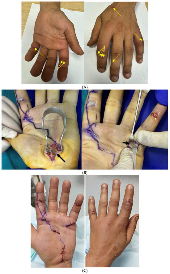 (A) Preoperative period. Palmar aspect: No visible abnormalities except for localized erythema over the proximal phalanx of the little finger. Dorsal aspect: A few bite marks are observed on the index and middle fingers. While no apparent abnormalities are visible, clinical findings strongly suggest significant underlying damage. Yellow arrows point to the locations of the bite wounds. (B) Intraoperative findings. Carpal tunnel was incised due to severe percussion-induced pain, revealing purulent fluid (large arrow). The flexor tendon sheath of the little finger was opened at the level of the A1 pulley, with purulent fluid clearly visible between the retractors (small arrow). Blue lines indicate possible incision pathways as per Brüner’s zigzag approach. (C) Postoperative, day 2. Wound closure was achieved using loose sutures.