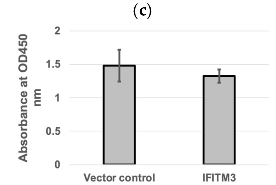 Western blotting analysis confirmed the expression of exogenous IFITM3 in cells transfected with a plasmid containing IFITM3-HA (Figure 1a), but not in cells transfected with the pQCXIP vector control (Figure 1a). Virus titers in the supernatants of cells harvested at 24 hpi showed an average of 5.4-fold decrease in IFITM3-HA-transfected cells compared to vector controls (p > 0.05) (Figure 1b). Cytotoxicity assay showed that there were no significant differences in cell viability between the vector control group and the IFITM3 over-expressing group (p > 0.05) (Figure 1c). The mean absorbance values of the vector control group and the IFITM3-over-expressing group were 1.48 and 1.32, respectively (Figure 1c). These results suggest that the over-expression of the IFITM3 protein reduces PRRSV replication.