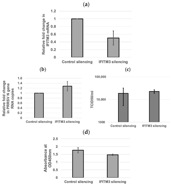 To validate the knockdown of endogenous IFITM3, qRT-PCR was performed to analyze the fold change in IFITM3 mRNA expression in IFITM3-silenced MARC-145 cells as compared to control silencing RNA. qRT-PCR confirmed the silencing of IFITM3, with an average of 50% knockdown efficiency (Figure 2a). The qRT-PCR and TCID50 assays were performed to quantify the viral RNA copies and supernatant virus titers in control silencing and IFITM3 silencing RNA-transfected cells. An average of 1.28-fold increase in viral RNA copies (p > 0.05) and a 1.22-fold increase in virus titers (p > 0.05) were observed in IFITM3 silencing RNA-transfected cells compared to control silencing RNA-transfected cells (Figure 2b,c). There were no significant differences (p > 0.05) in cell viability between control silencing RNA and IFITM3 silencing RNA (Figure 2d). The mean absorbance values of the negative control silencing group and IFITM3 silencing group were 1.76 and 1.47, respectively (Figure 2d). This shows that the knockdown of IFITM3 slightly enhanced virus replication.