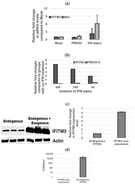 When compared to the non-treated control group, PRRSV infection in MARC-145 cells upregulated Mx1 gene expression but not that of IFITM3 (Figure 3a). IFN-alpha treatment induced the upregulation of mRNA gene expression of both IFITM3 and Mx1 as compared to the control group (Figure 3a). At a 50 U/mL IFN-alpha concentration, the mean fold change in IFITM3 gene expression as compared to IFN-alpha-untreated cells was 1.94 (Figure 3b). At a 100 U/mL concentration of IFN-alpha, the mean fold change in IFITM3 gene expression was 3.73 (Figure 3b). At 500 U/mL concentration of IFN-alpha, the mean fold change in IFITM3 expression was 4.91 (Figure 3b). A dose-dependent increase in IFITM3 mRNA level in IFN-alpha-treated MARC-145 cells was detected. As compared to the IFN-alpha-untreated group infected with PRRSV, the mean fold changes in the PRRSV N gene transcripts upon treatment with IFN alpha at 50 U/mL, 100 U/mL, and 500 U/mL were 0.34, 0.16, and 0.07, respectively (Figure 3b). A dose-dependent decrease in PRRSV gene transcript in IFN-alpha-treated MARC-145 cells was observed. These results showed an inverse correlation between IFITM3 expression and PRRSV replication in IFN-alpha-treated MARC-145 cells.